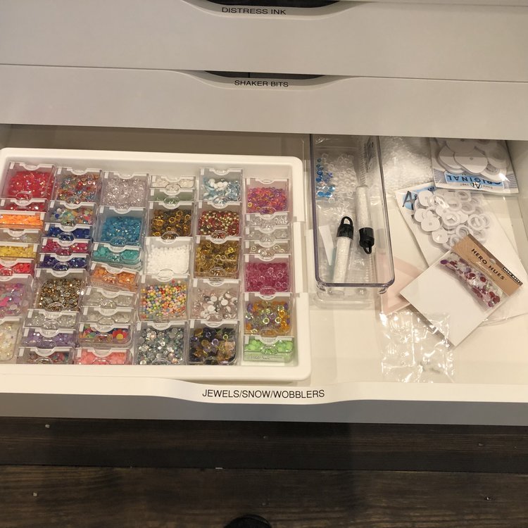 I measured, counted, made spread sheets. I looked at my motions – what did I use most often, because I wanted those things closest to me. I also tried to plan ahead for any new products out there. You know, like – paper, stamps, dies, alcohol inks, nuvo drops, sequins and beads. Did I mention paper, stamps and ink – oh my!
