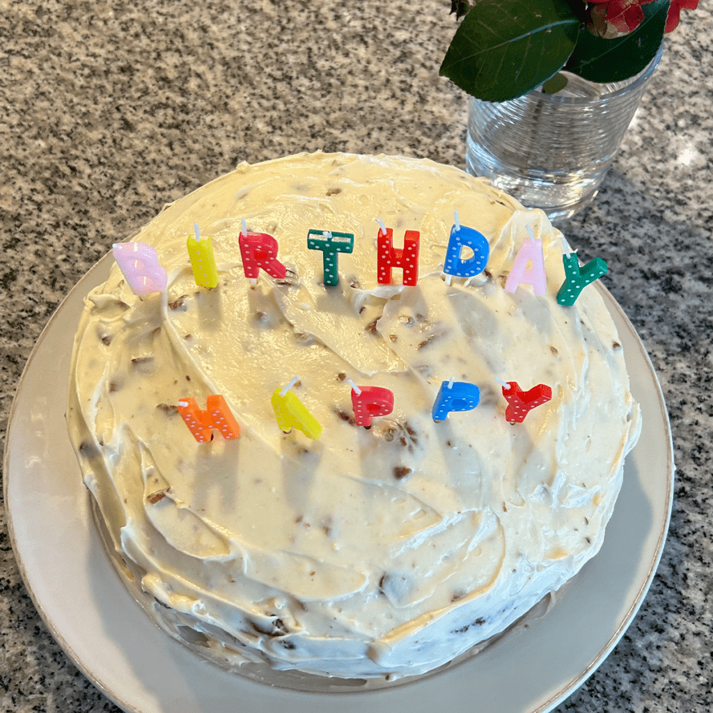 Normally I make it in a 9×13 cake pan. This last time, in celebration of my daughter's 30th birthday, I made a 2 layer cake. And it looked pretty good. I do struggle with getting the icing to look nice.