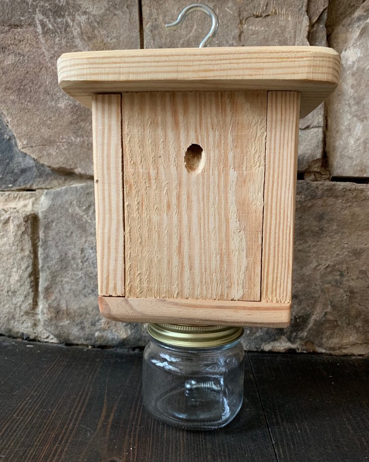 Hang carpenter bee boxes. Are carpenter bee boxes effective? The idea behind these boxes is this: they see the hole, fly in and get stuck in the jar. I was told to kill one and rub it on the holes and this would attract new bees to the carpenter bee box. This is a new strategy for me. I just bought 4 of these boxes and I am really hoping that they work – I think I need a few more.