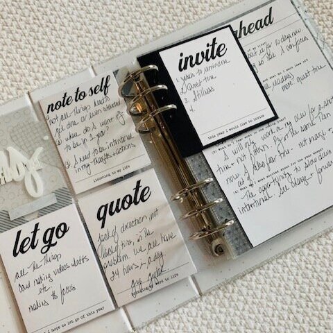 There are 7 of these little cards to journal on. The months of the year are printed on transparent sheets that fit in the page protectors. January was white – I colored it with a black sharpie.