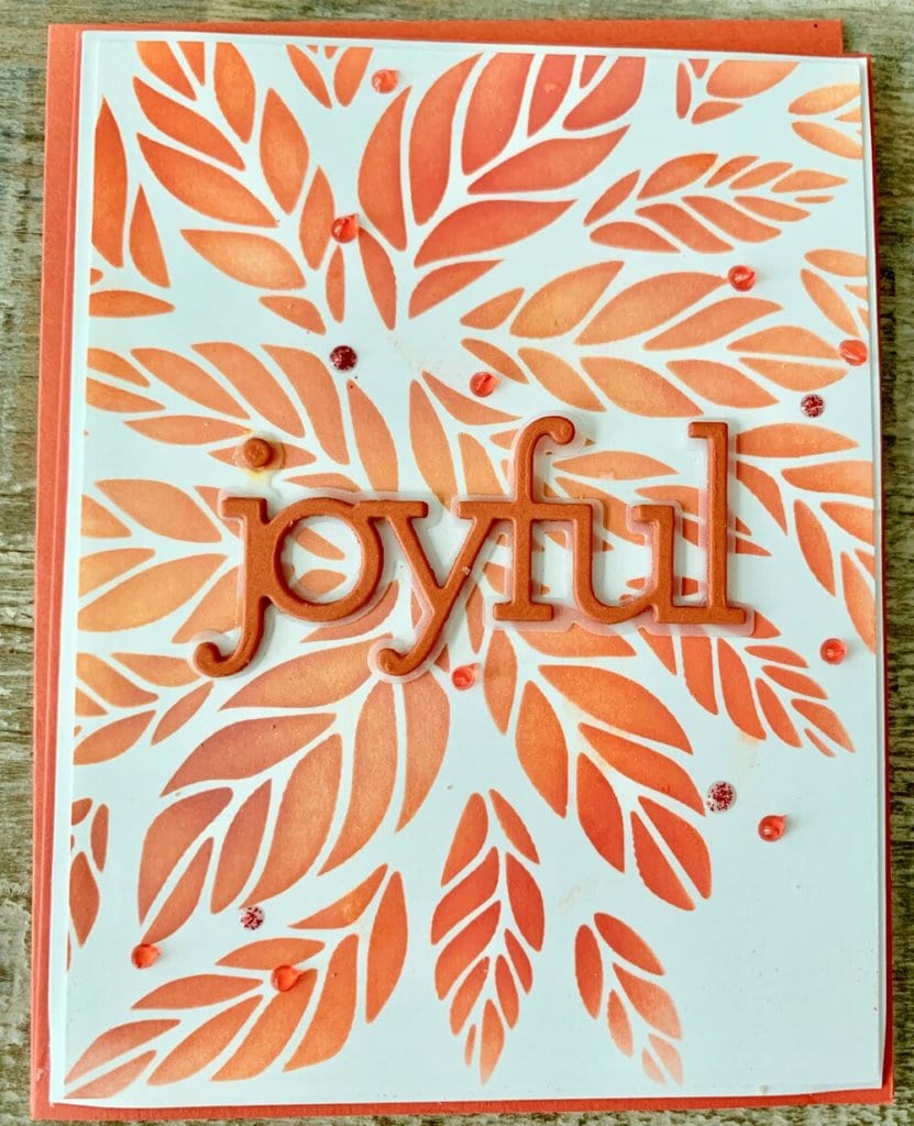 Simon Says Stamp Tumbling Leaves stencil Distress Oxide inks – Fired Brick, Candied Apple, Barn door, Ripe Persimmon & Wild Honey Simon Says Stamp Joyful Die Simon Says Stamp & Gina K envelopes Ellen Hutson 40# vellum