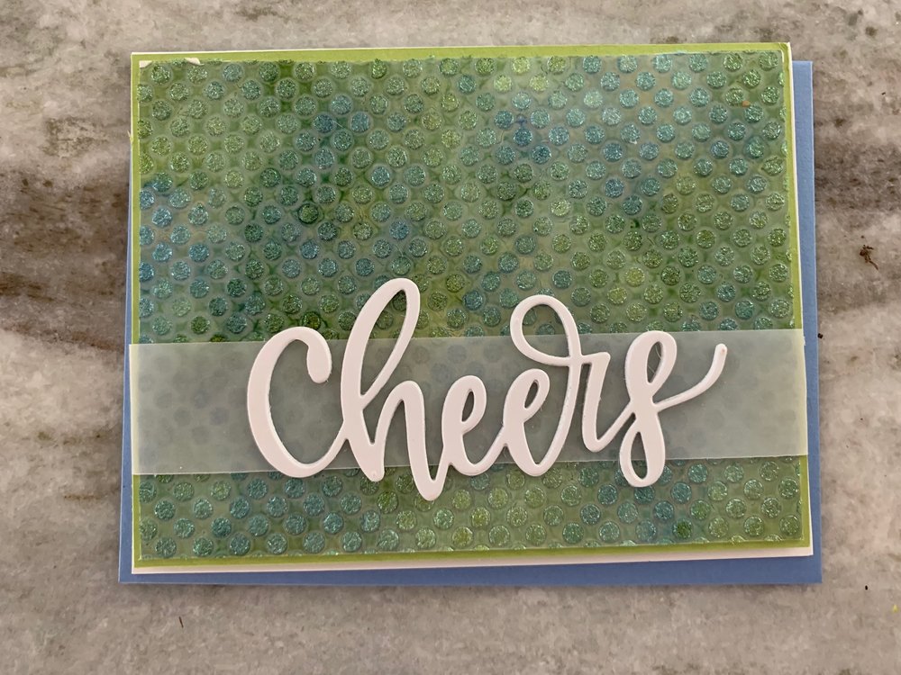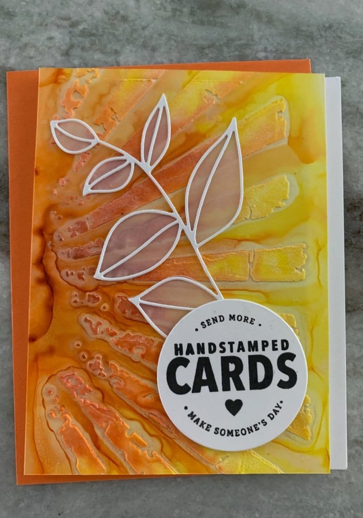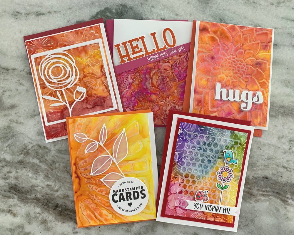 I was totally inspired by Jennifer McGuire when making these backgrounds. (I will link to her video below). I went to my craft room and made a ton, and I mean a ton (like 40) backgrounds. I tried all different kinds of things with my Alcohol Pearl Inks. I brought out embossing folders and stencils I haven’t used in years. After I was done making all those awesome backgrounds, I went thru all of my die cuts (especially the words) and tried to keep the cards simple – so that the awesome background was the focal point.